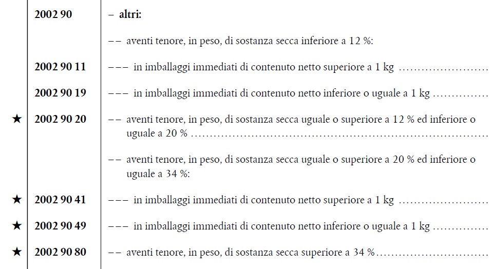 Ipotizzando quindi un tenore in peso di sostanza secca inferiore al 12% e imballaggi immediati di contenuto netto inferiore o uguale a 1 kg, il prodotto deve essere classificato con il codice doganale 2002 90 19.