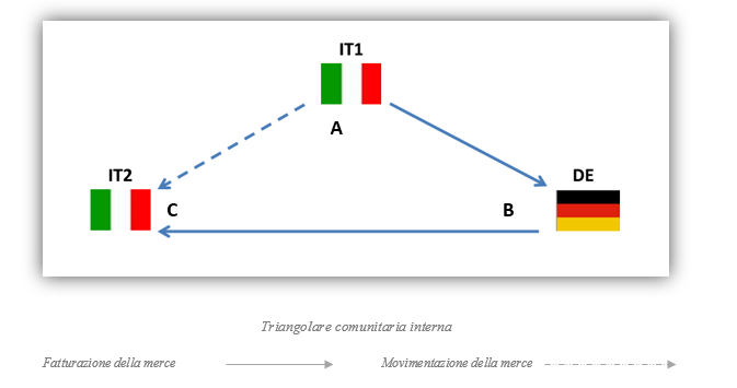 Nel caso pratico di seguito riportato sarà analizzato uno scenario di triangolazione comunitaria interna, dove il primo cedente nazionale (IT1) vende merce ad un soggetto comunitario (DE), promotore della triangolazione; quest’ultimo effettuerà una seconda cessione nei confronti di un soggetto nazionale (IT2), destinatario della merce. I beni non entreranno nella disponibilità materiale di DE in quanto, su incarico di quest’ultimo, vengono inviati direttamente a IT2, destinatario finale della merce.